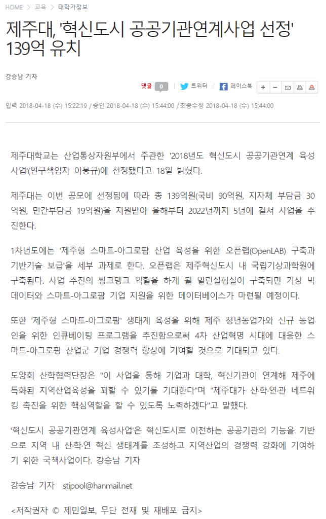 제주대학교는 산업통상자원부에서 주관한 ‘2018년도 혁신도시 공공기관연계 육성사업'(연구책임자 이봉규)에 선정됐다고 18일 밝혔다.