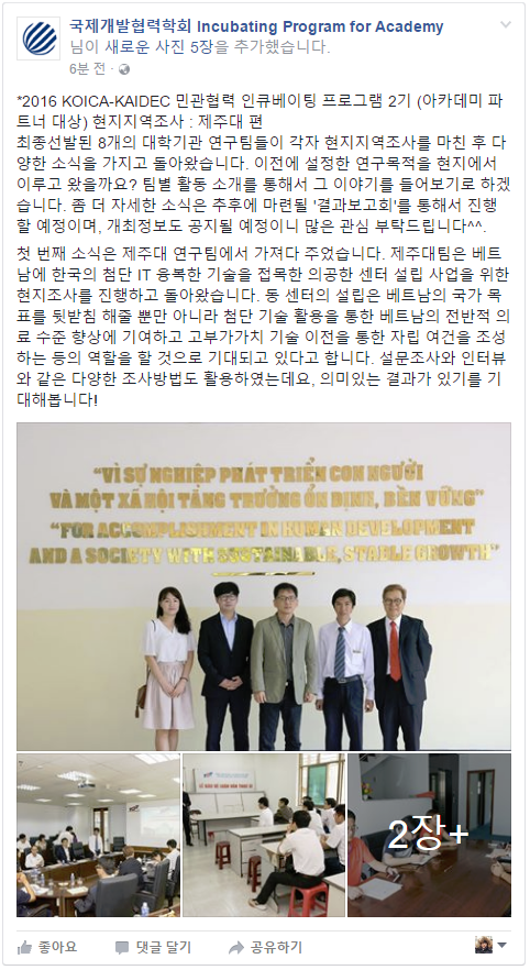 첫 번째 소식은 제주대 연구팀에서 가져다 주었습니다. 제주대팀은 베트남에 한국의 첨단 IT 융복한 기술을 접목한 의공한 센터 설립 사업을 위한 현지조사를 진행하고 돌아왔습니다. 동 센터의 설립은 베트남의 국가 목표를 뒷받침 해줄 뿐만 아니라 첨단 기술 활용을 통한 베트남의 전반적 의료 수준 향상에 기여하고 고부가가치 기술 이전을 통한 자립 여건을 조성하는 등의 역할을 할 것으로 기대되고 있다고 합니다. 설문조사와 인터뷰와 같은 다양한 조사방법도 활용하였는데요, 의미있는 결과가 있기를 기대해봅니다!